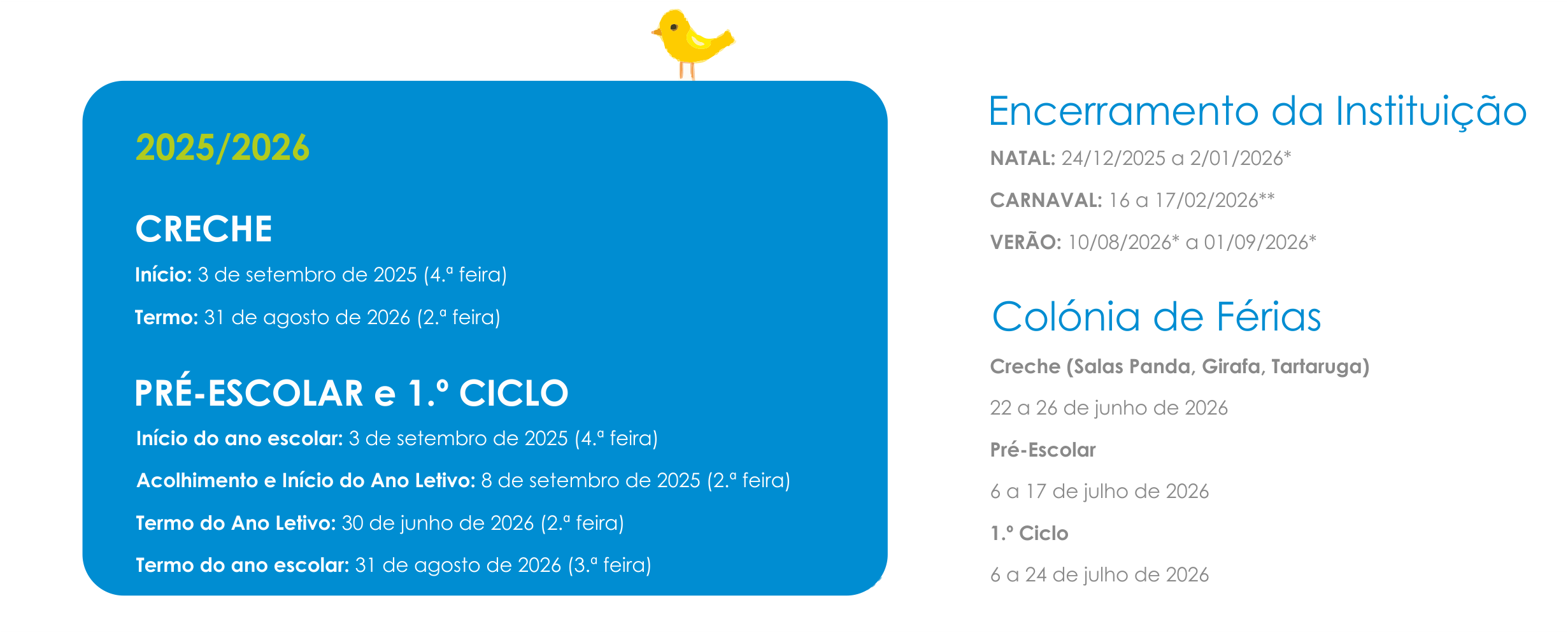 NOTA: as atividades de Música e Educação Física nas salas dos 24/36 meses da Creche também se suspendem nos períodos correspondentes às interrupções letivas do Pré-Escolar e do1.º Ciclo e demais períodos de encerramento da Associação Ester Janz